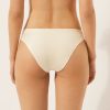 Brazilian bikini bottoms with adjustable side panels, featuring a minimal fit that exalts the silhouette with a touch of sensuality and refinement. The slightly rounded waist at the front allows for both a regular and more high-cut fit, depending on one’s physique. The bright silk-effect fabric embellished by elegant golden details radiates a sophisticated sensation of discrete luxury. Fully lined with invisible seams.