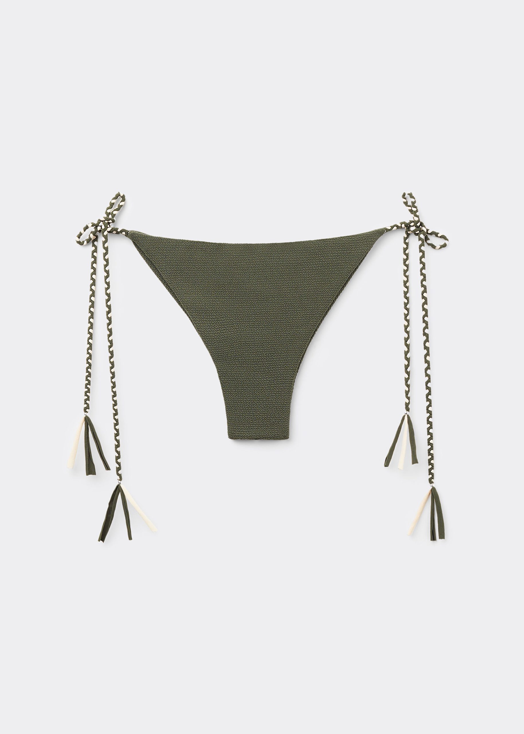 Brazilian cut bikini bottoms with side ties. The slightly rounded waist at the front allows for both a regular and more high-cut fit, depending on one’s physique. The 3D crinkled fabric, enriched by a braided string, provides a touch of sophisticated elegance. Fully lined with invisible seams.