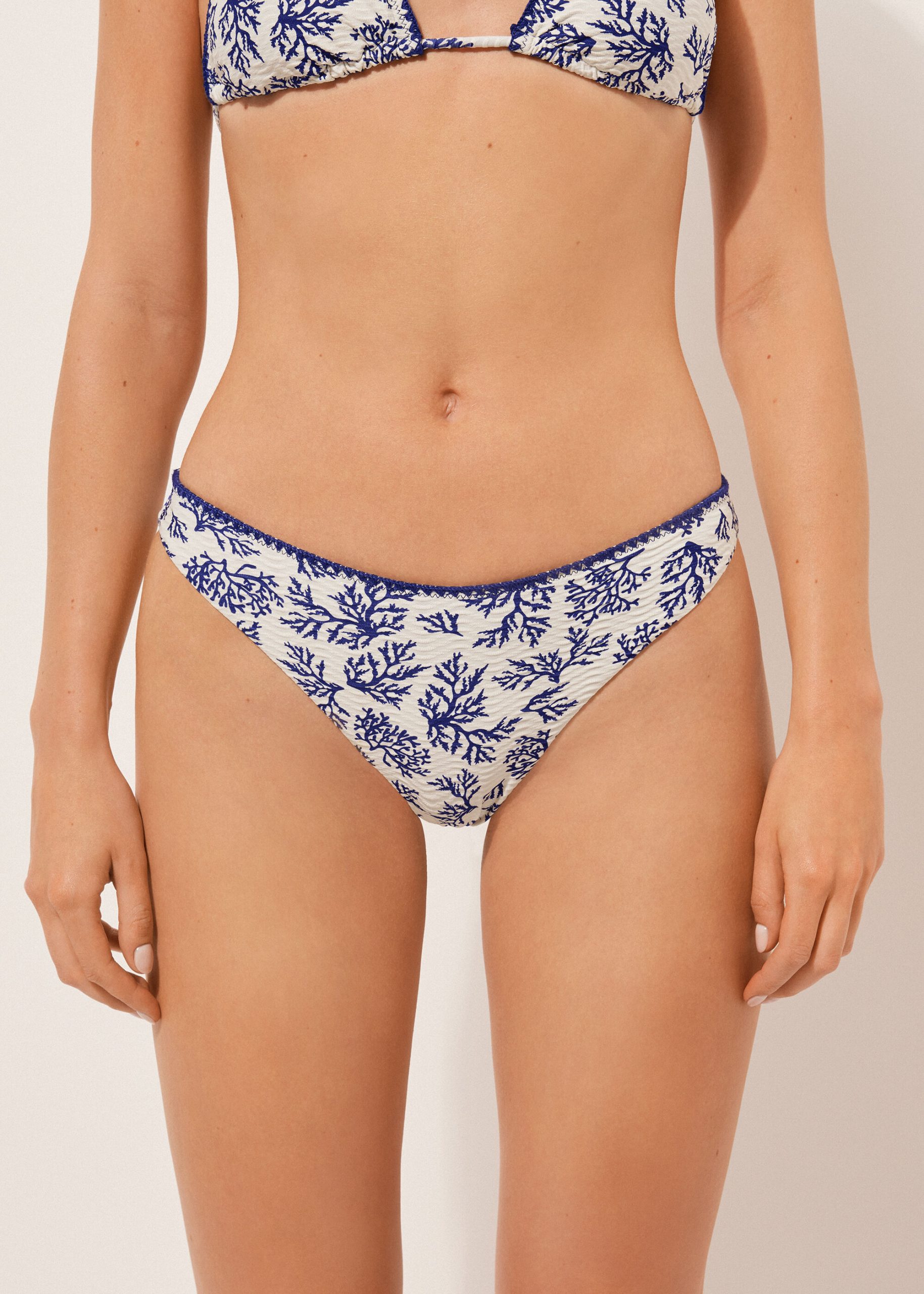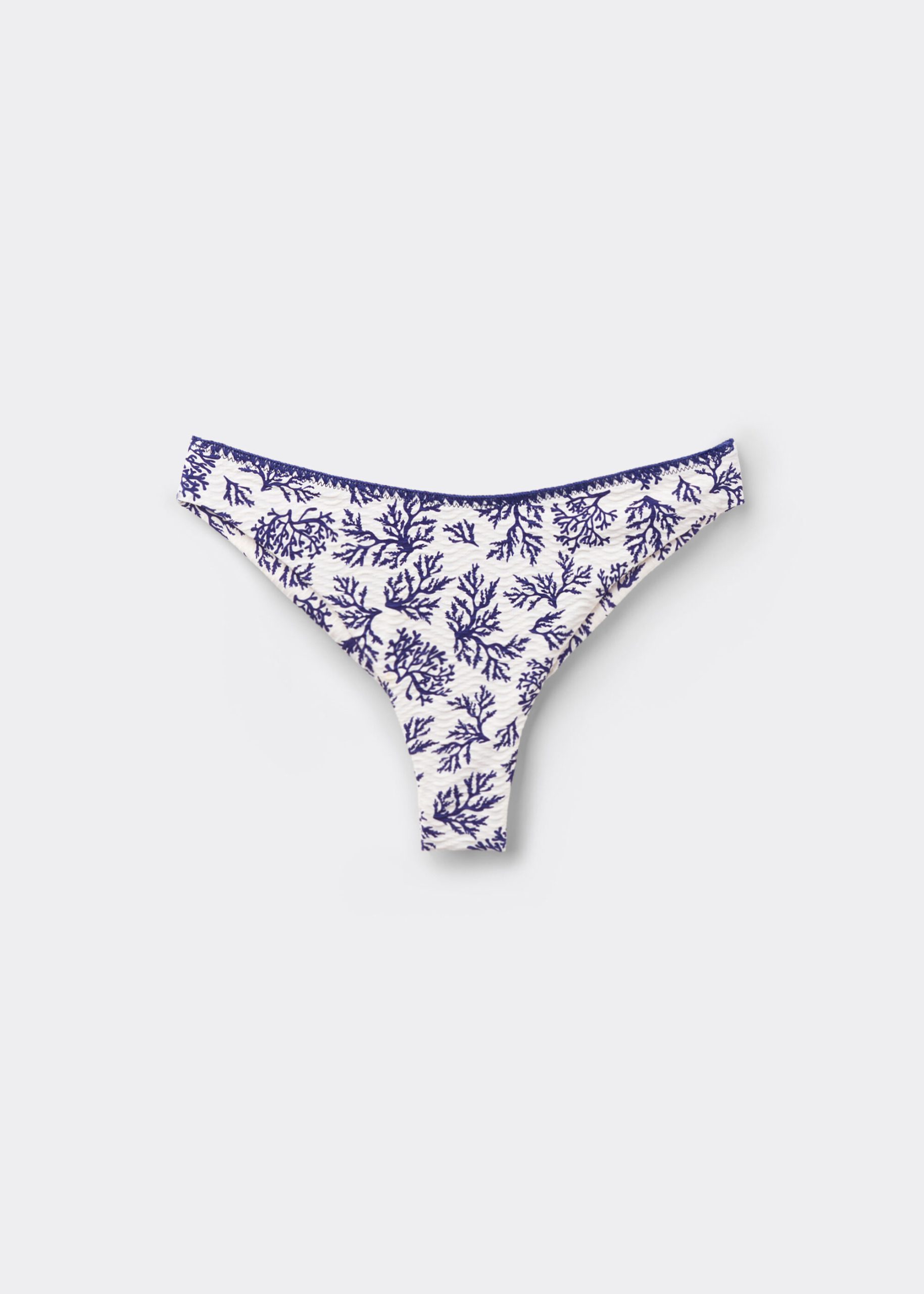 Brazilian bikini bottoms with invisible seams. The slightly rounded waist at the front allows for both a regular and more high-cut fit, depending on one’s physique. A marine blue coral print on slightly crinkled fabric, which creates a fresh, refined and dynamic effect.