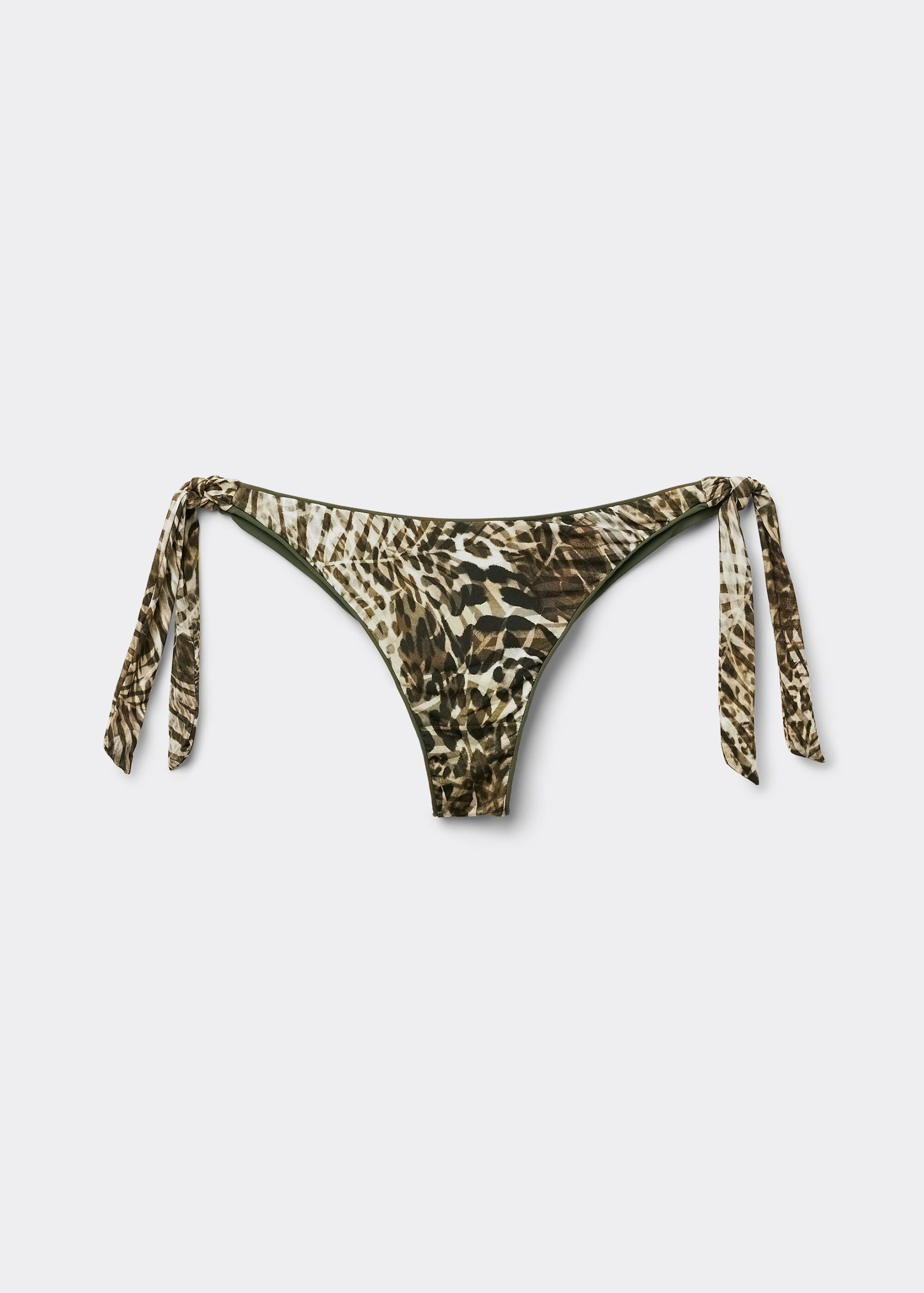 Brazilian bikini bottoms with side tie closure to adjust the fit. The slightly rounded waist allows it to be worn either as normal or with the legs higher to show off the physique. Reminiscent of animal print, the foliage pattern brings together exotic leaf designs with motifs that evoke markings from the animal world. Back with central seam that ensures a better fit.