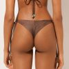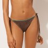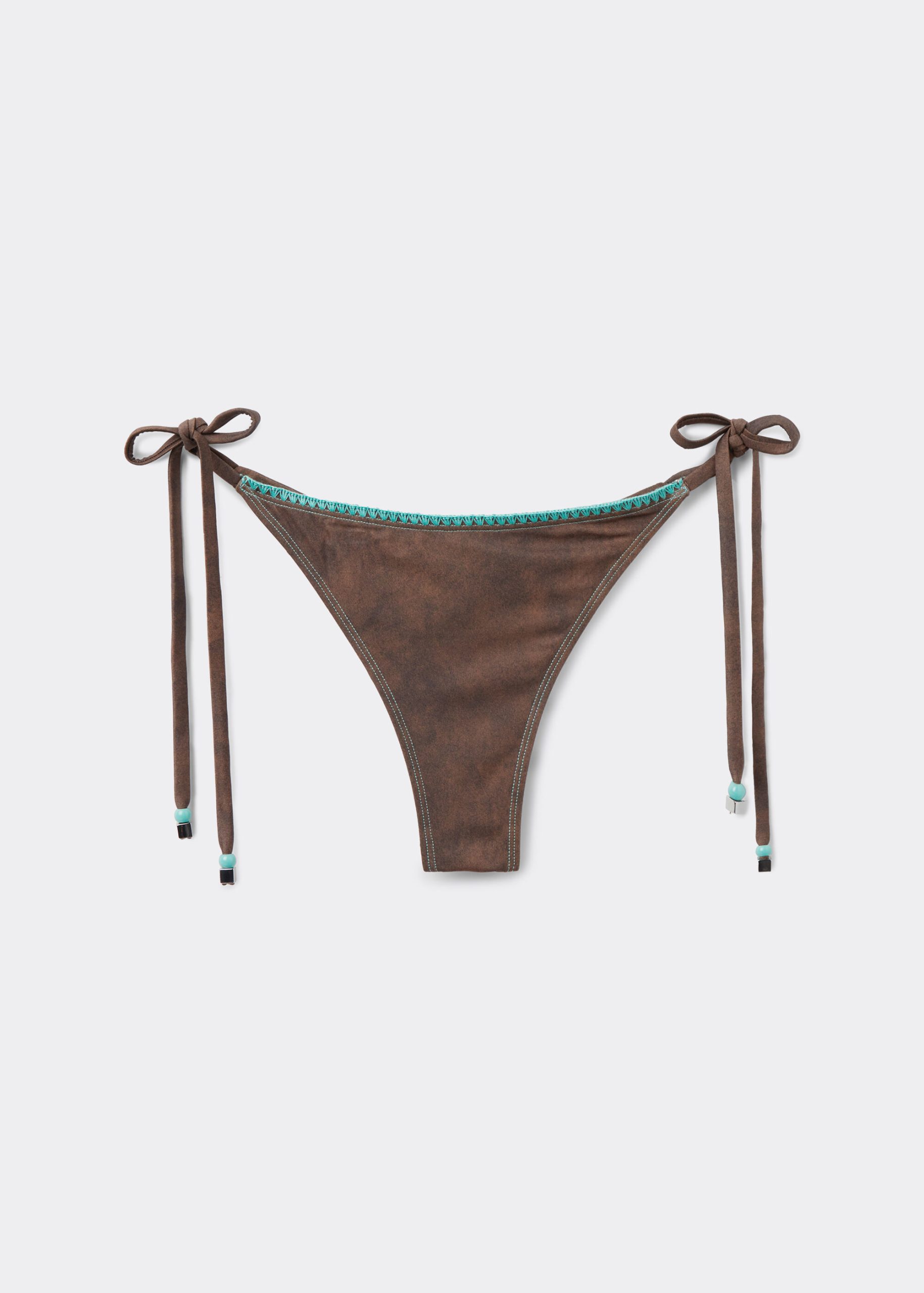 Bikini bottoms with side ties to adjust the fit. Made from a buckskin effect fabric, enriched by color contrast trim for a touch of Texan style glamour. Fully lined with invisible seams.