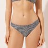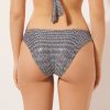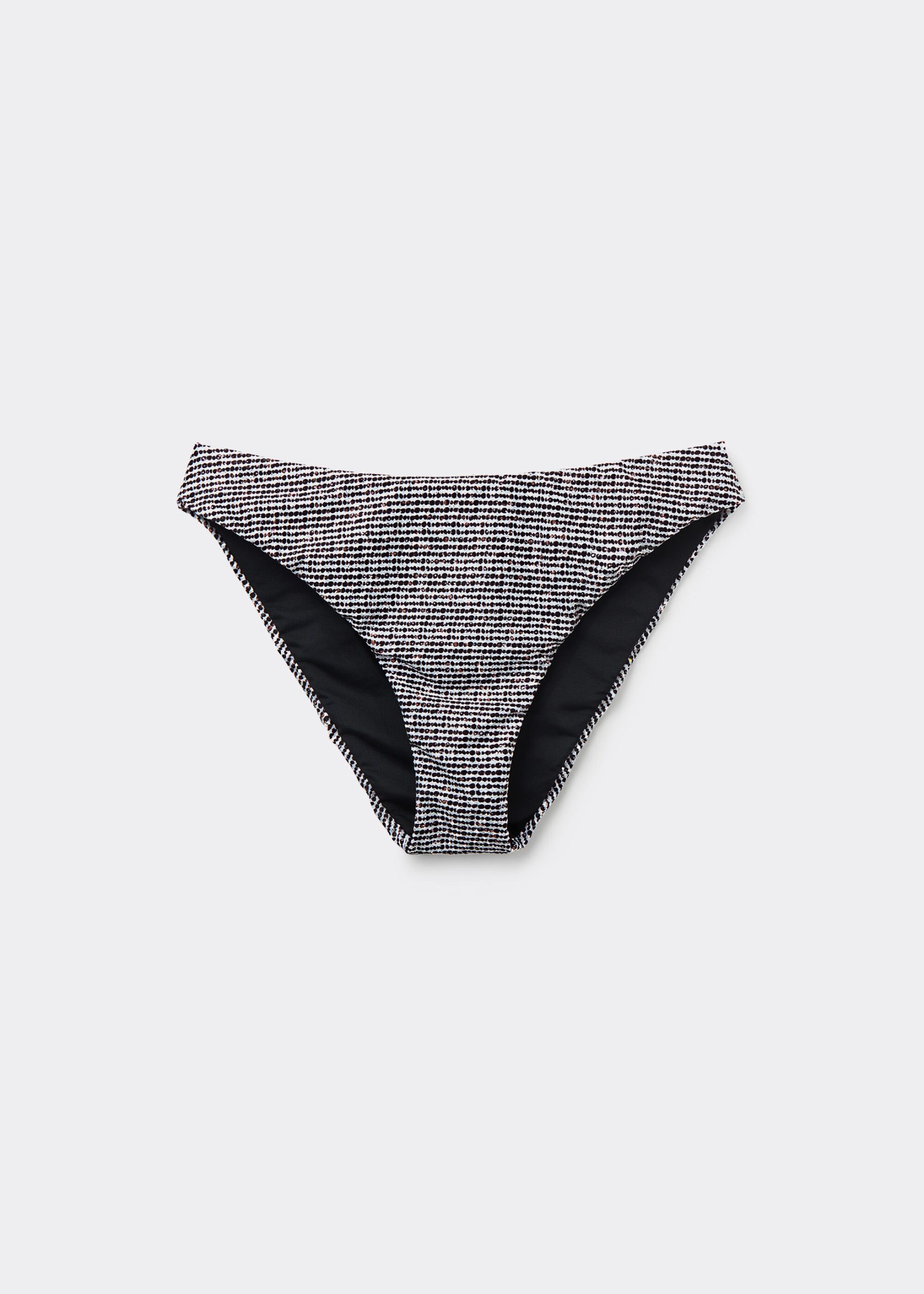 Fully lined bikini bottom with invisible seams in a black and white toned pattern embellished with a coated effect. The slightly rounded waist at the front allows for both a classic or more high-cut fit, depending on one’s physique.