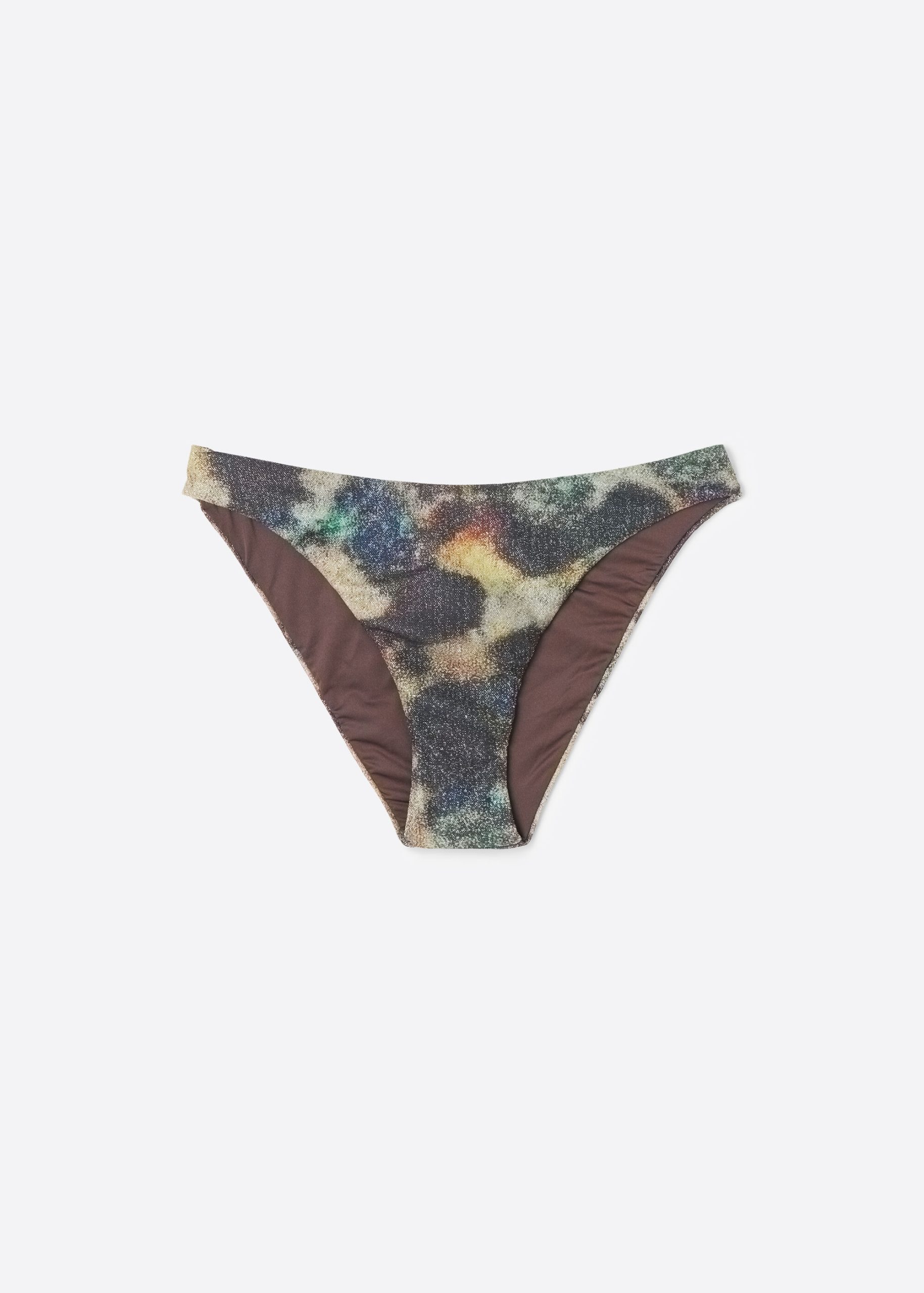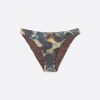 Fully lined bikini bottoms with invisible seams. The slightly rounded waist at the front allows for both a regular and more high-cut fit, depending on one’s physique. The style features a lamé fabric with a camouflage print.