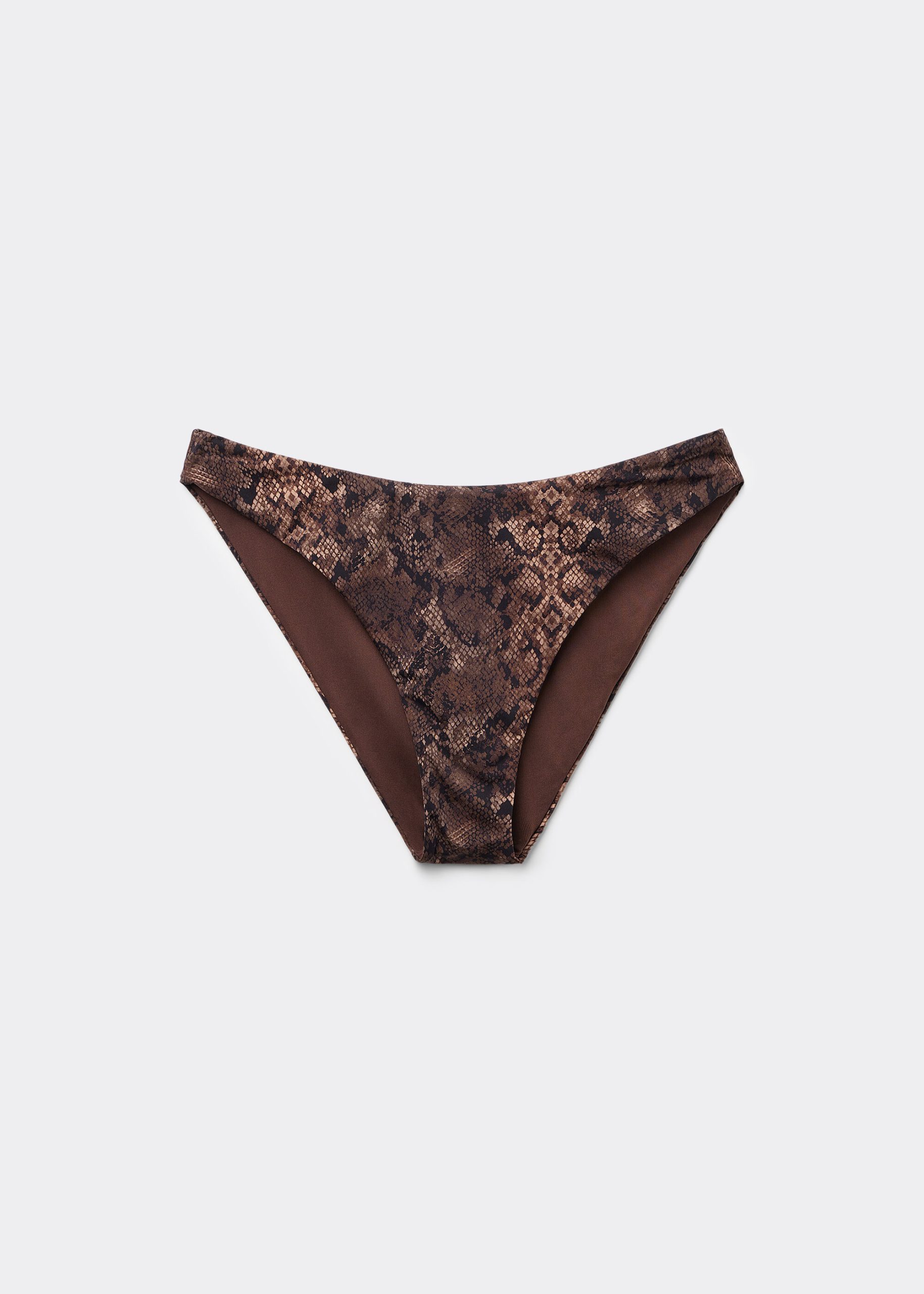 Fully lined bikini bottoms with invisible seams in order to not leave marks. The rounded waist at the front allows for both a classic or more high-cut fit, depending on one’s physique. The style features a sophisticated dark brown animal pattern.
