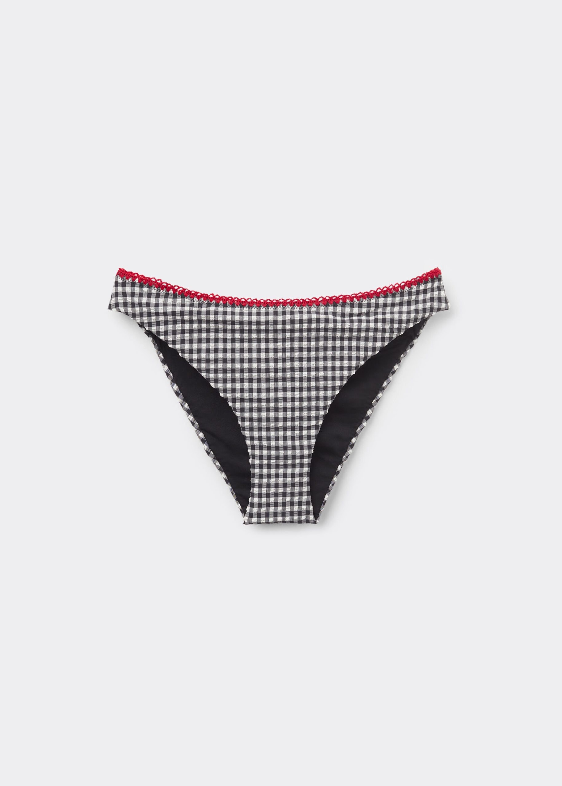 Fully lined bikini bottoms with invisible seams made from a vichy pattern fabric, enriched by a refined red trim. The slightly rounded waist at the front allows for both a classic or more high-cut fit, depending on one’s physique.