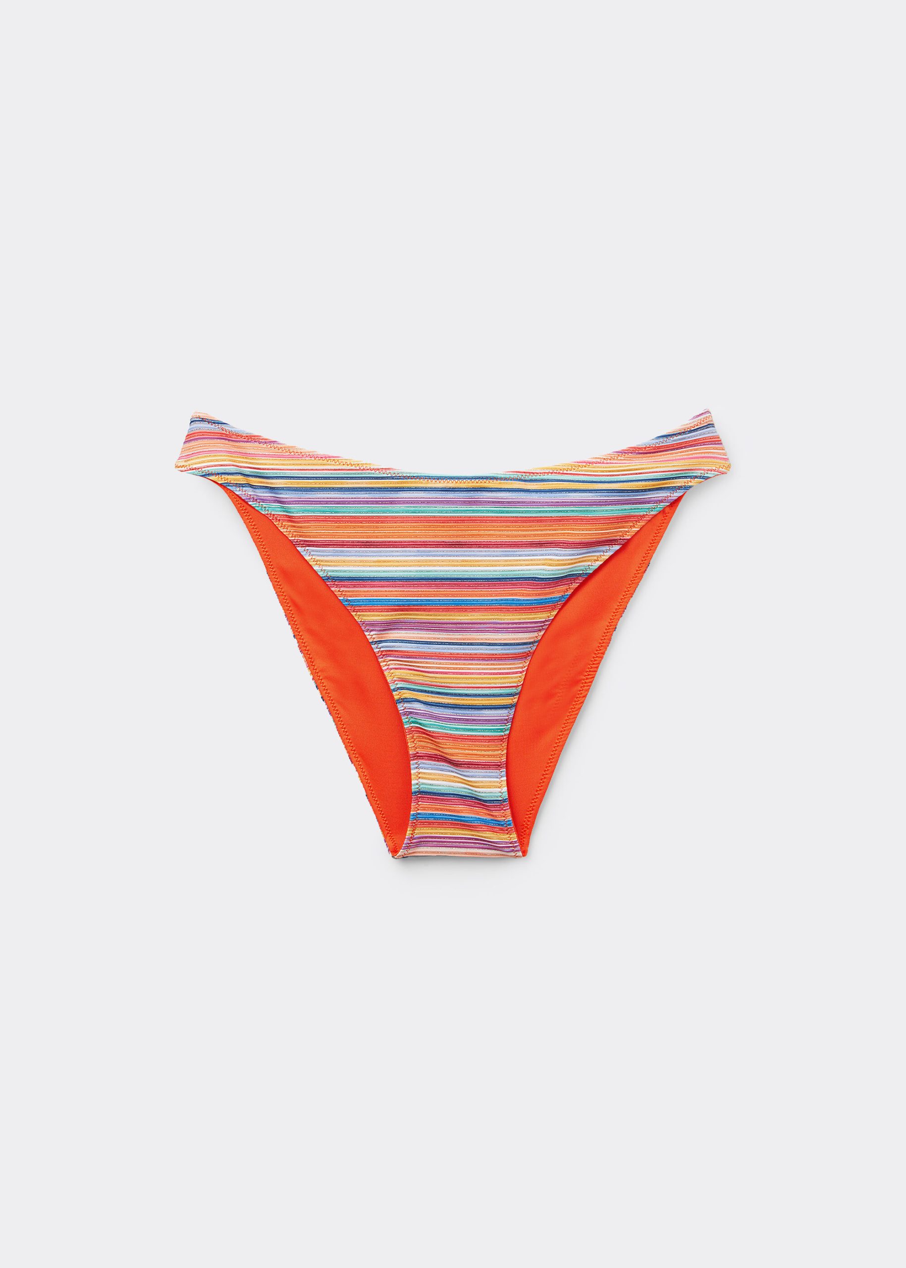 Fully lined bikini bottoms with invisible seams in order to not leave marks. The rounded waist at the front allows for both a classic or more high-cut fit, depending on one’s physique. Striped patterned fabric in bright colors enhanced with sparkling glitter, creating a dynamic and contemporary effect with its soft texture and vibrant look.