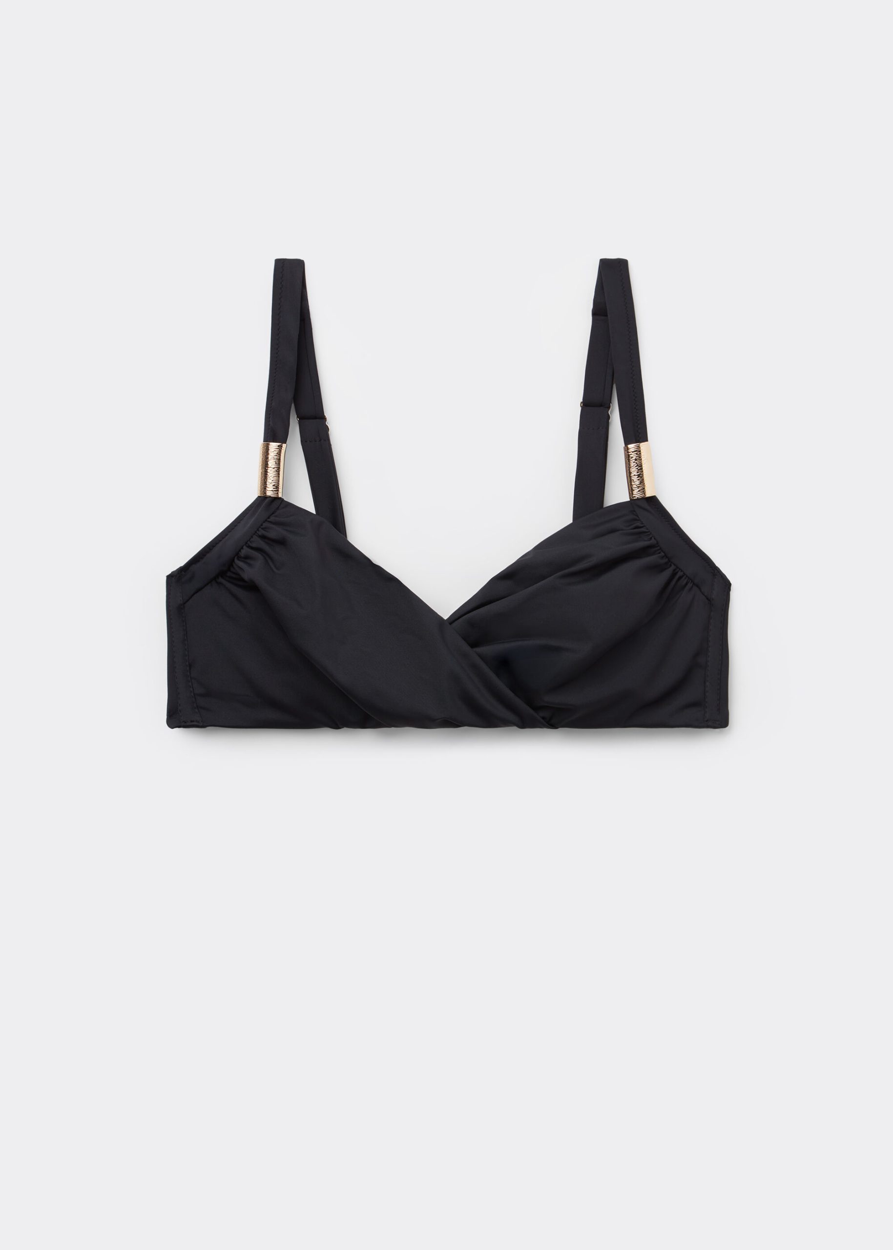 Unpadded balconette bikini top with underwire, embellished with an elegant central crisscross detail. The structure of the cups and the wide fit at the sides provide good support for larger busts. The compact fabric, designed to exalt and enhance the body’s curves, ensures excellent support and is studied to make every woman feel at ease without constraint. Adjustable shoulder straps. Back closure with two hook-and-eye closures to improve the fit of the underband.