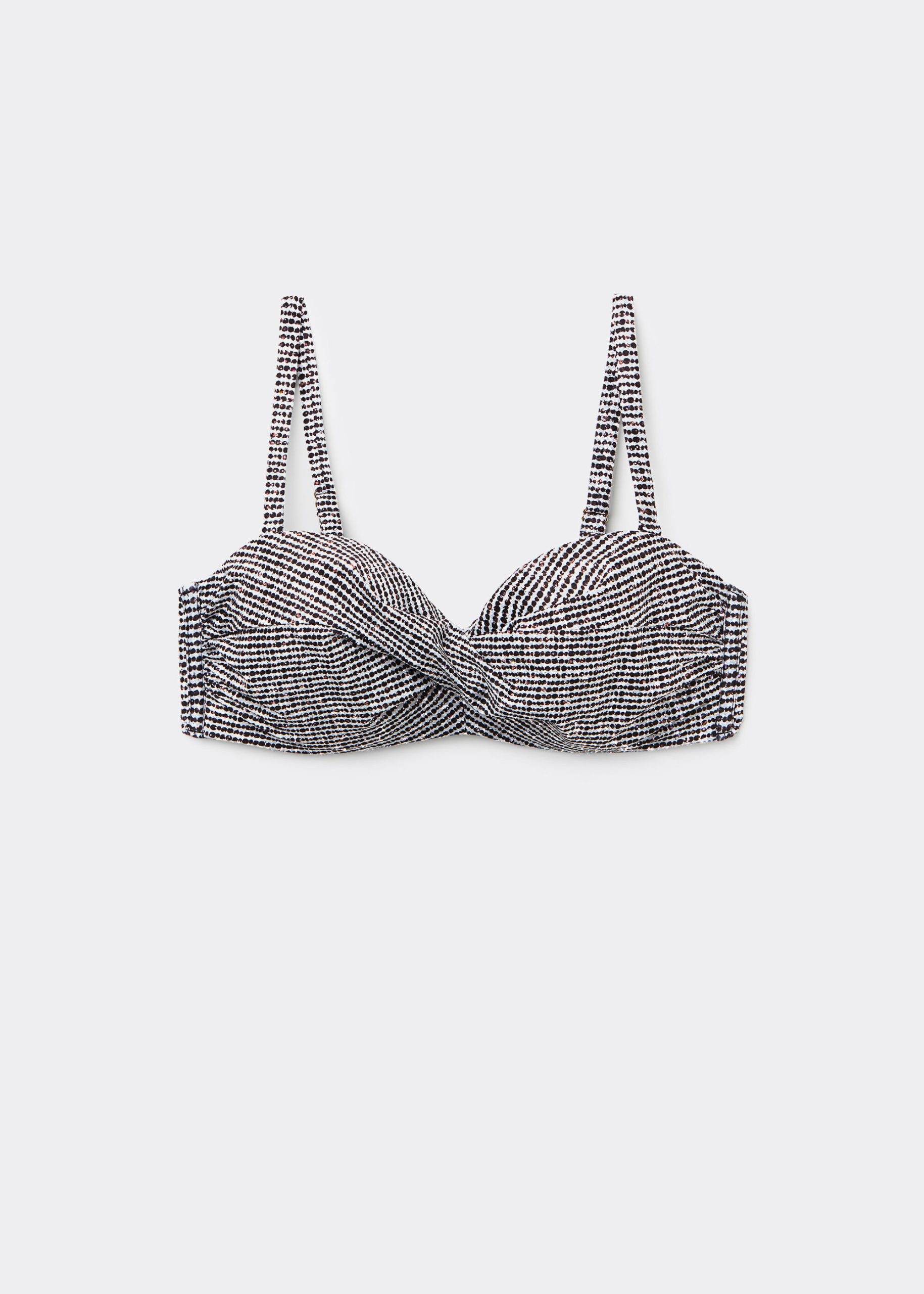 Lightly padded bandeau bikini top with underwire and side boning to guarantee good support, perfect for those with larger busts. The style features a black and white toned pattern embellished with a coated effect. Adjustable and removable shoulder straps. Back hook closure with two adjusters.