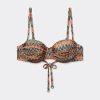 Bandeau bikini top with lightly padded cups. The side boning guarantees good support. The multicolored pattern, featuring a wave motif and a bold mix of bright colors, has a dynamic effect ideal for the summer. Adjustable and removable shoulder straps. Back tie closure.