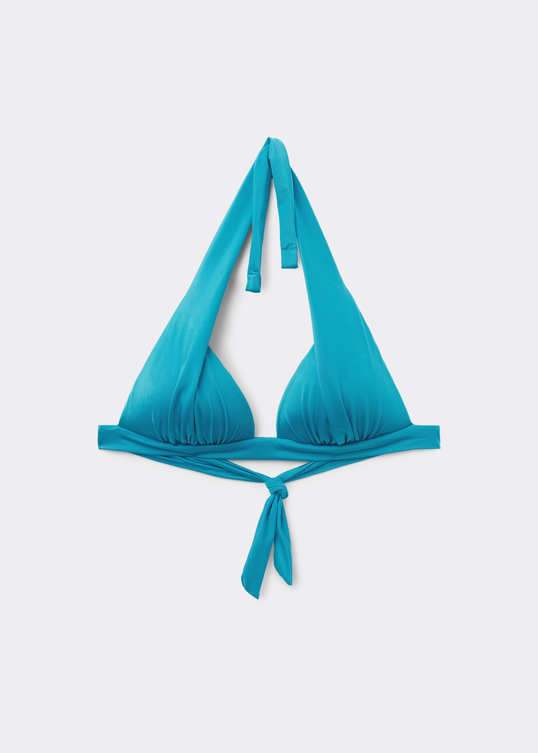 Wireless fixed triangle bikini top with graduated padded cups that add volume to enhance the décolleté. The style features a bright fabric with a silky effect, embellished by ruffles. The shoulder straps have eyelets on the ends so they can be hooked onto the back band or tied behind the neck. Back tie closure.