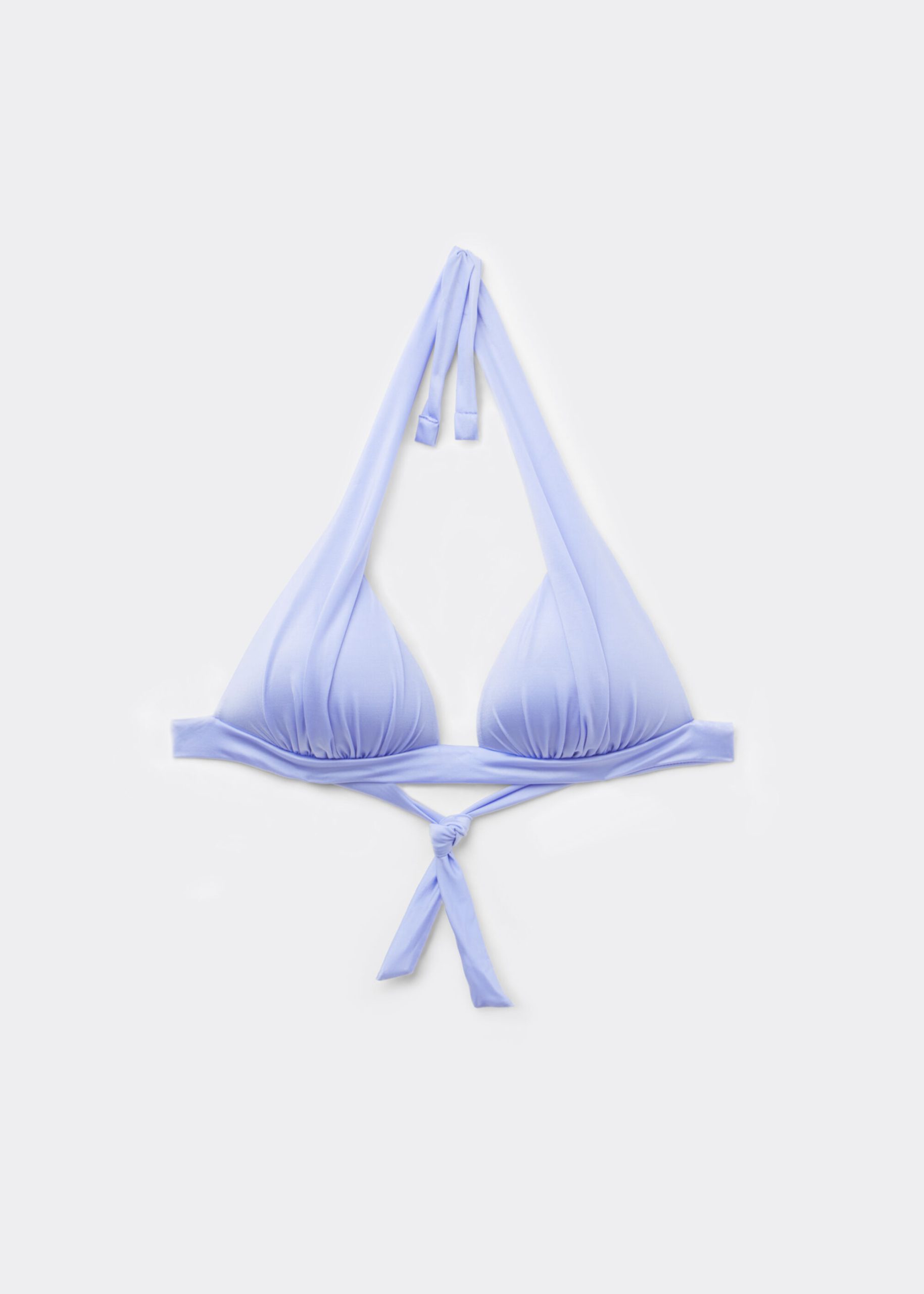 Wireless fixed triangle bikini top with graduated padded cups that add volume to enhance the décolleté. The style features a bright fabric with a silky effect, embellished by ruffles. The shoulder straps have eyelets on the ends so they can be hooked onto the back band or tied behind the neck. Back tie closure.