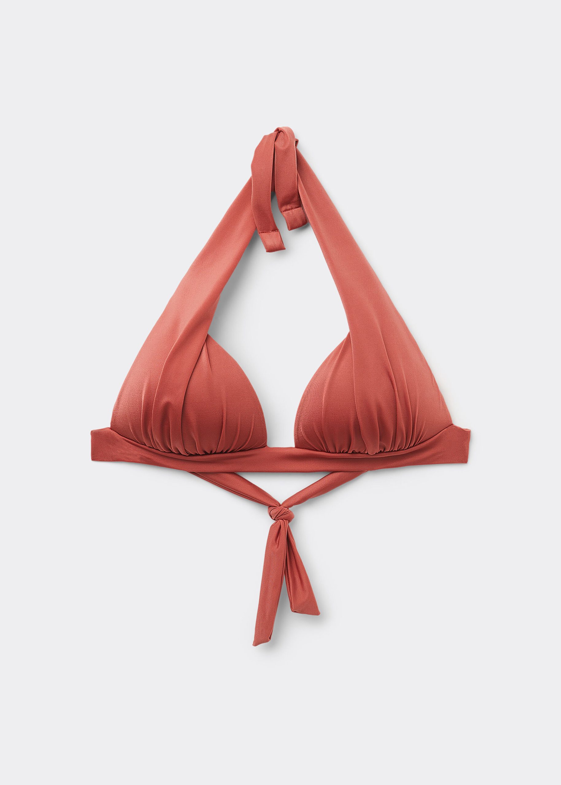 Wireless fixed triangle bikini top with graduated padded cups that add volume to enhance the décolleté. The style features a bright fabric with a silky effect, embellished by ruffles. The shoulder straps have eyelets on the ends so they can be hooked onto the back band or tied behind the neck. Back tie closure.
