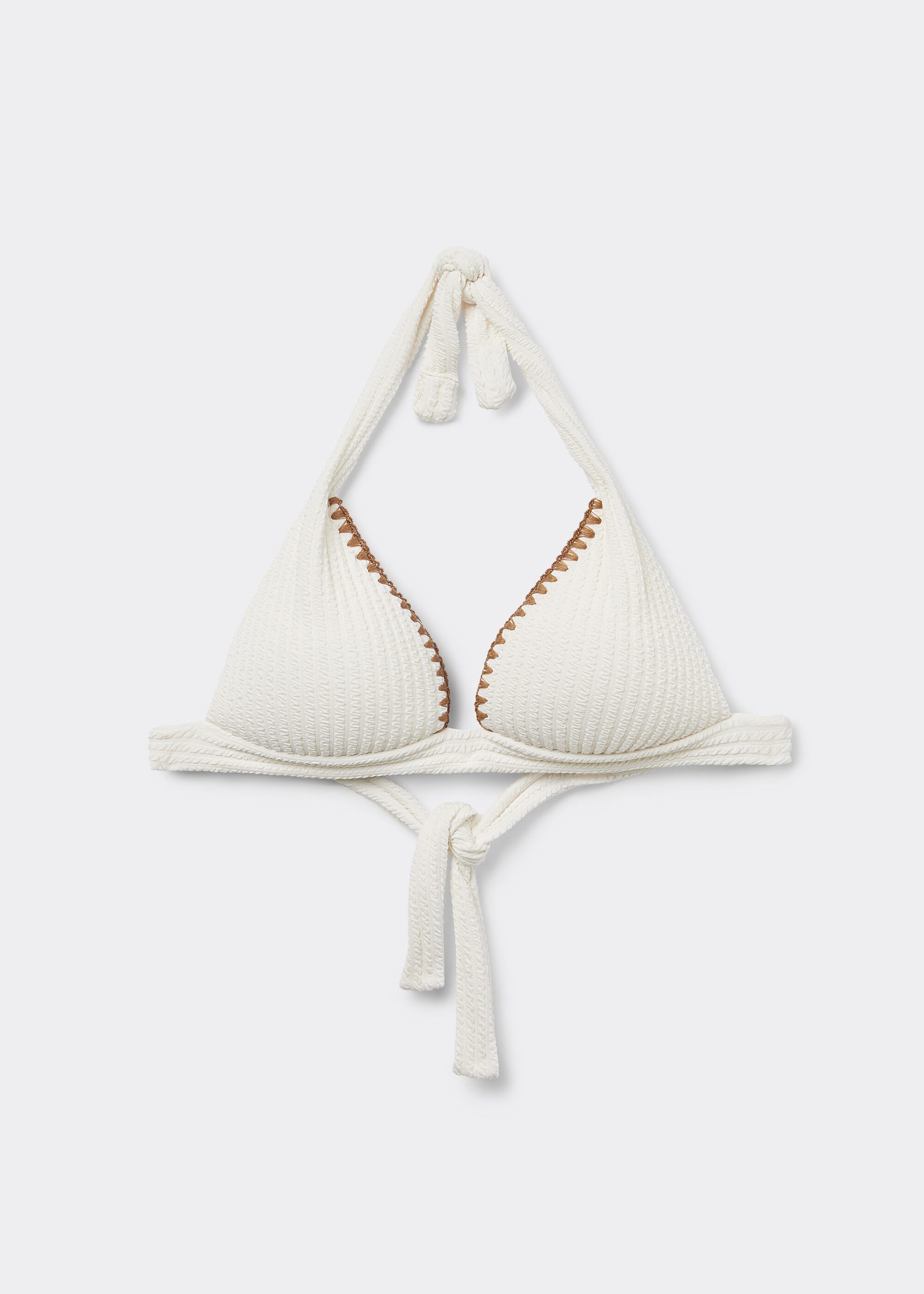 Wireless fixed triangle bikini top with graduated padded cups that add volume to enhance the décolleté. The style features a crinkle fabric embellished with contrast color embroidery. The shoulder straps have eyelets on the ends so they can be hooked onto the back band or tied behind the neck. Back tie closure.