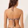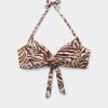 Wireless fixed triangle bikini top with graduated padded cups that add volume. The crisscross on the neckline enhances the décolleté. The style features a sophisticated Brown Zebra print. The shoulder straps have eyelets on the ends so they can be hooked onto the back band or tied behind the neck. Back tie closure. The cups in size XLu002F40 are lightly padded.
