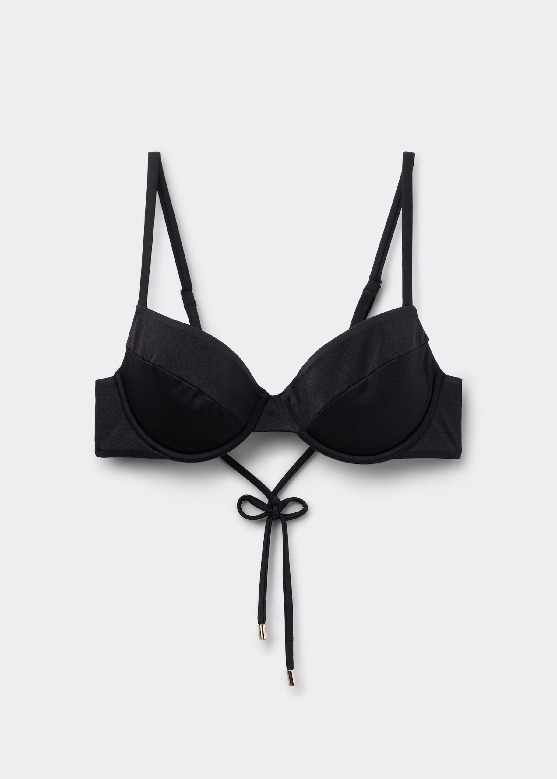 Push-up bikini top with lightly padded cups and underwire, designed to offer volume and a chic and refined appeal. Made from a bright fabric, it features an elegant bustier effect on the back, embellished by a sophisticated crossing of strings that exalt its sensual design. The adjustable shoulder straps and string tie fastening on the back offer a personalized fit, perfect for an elegant and modern summer look.