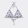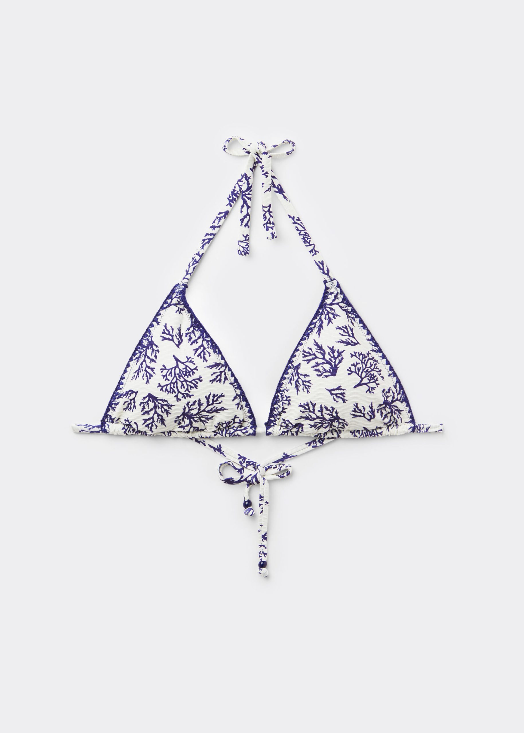 Slide triangle bikini top with removable cups and no underwire for a natural effect. A marine blue coral print on slightly crinkled fabric, which creates a fresh, refined and dynamic effect. The shoulder straps have eyelets on the ends so they can be hooked onto the back band or tied behind the neck. Back string tie closure.