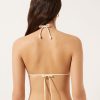 Slide triangle bikini top with removable padding, wireless for a natural effect. The refined and sophisticated crochet fabric is enriched by a small medal on the center front gore that exalts its elegance. The shoulder straps have eyelets on the ends so they can be hooked onto the back band or tied behind the neck. Back string tie closure.