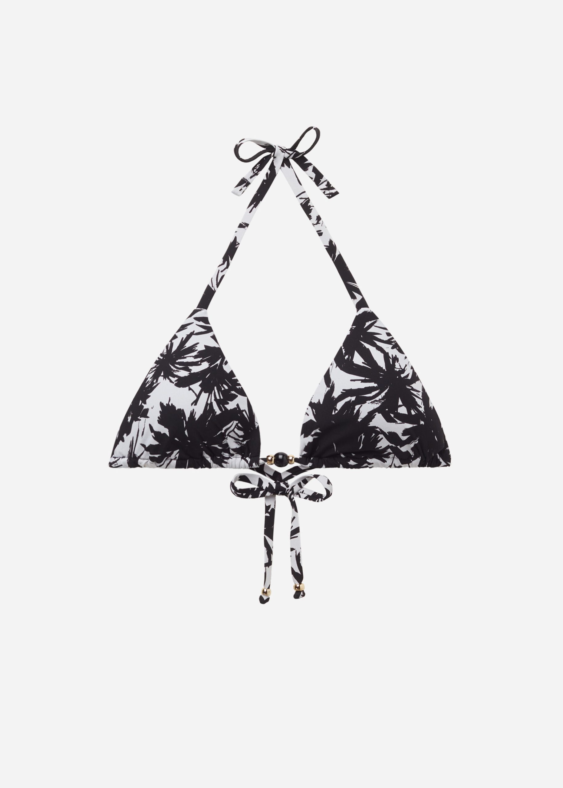 Slide triangle bikini top with removable padding, wireless for a natural effect. The style features a black and white palm tree patterned fabric with small two-tone pearl embellishments. The shoulder straps have eyelets on the ends so they can be hooked onto the back band or tied behind the neck. Back string tie closure.