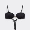 Unpadded balconette swimsuit top with underwire, featuring a minimal fit that exalts the silhouette with a touch of sensuality and refinement. The bright silk-effect fabric embellished by elegant golden details radiates a sophisticated sensation of discrete luxury. Adjustable shoulder straps and string tie fastening complete the design for this summer look that does not pass by unnoticed.