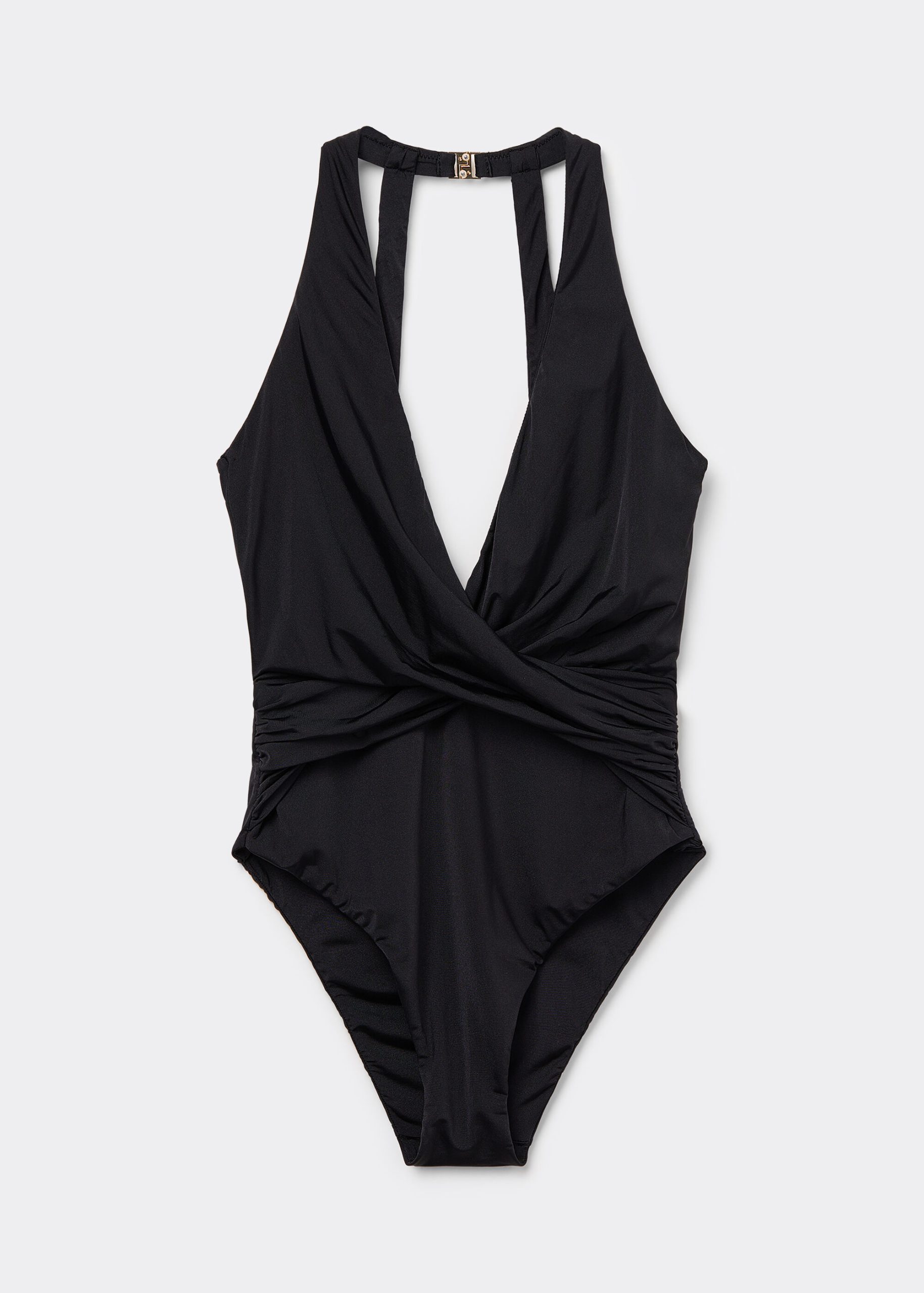 One piece swimsuit in soft microfiber, wireless and unpadded for a natural effect. The style features a deep front surplice neckline. Fully lined and invisible stitching in order to not mark the figure. Slightly high-cut legs with regular back coverage.
