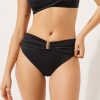 High-waisted bikini bottoms with draping and mobile golden accessory with a shaping effect on the abdomen. The compact fabric, designed to exalt and enhance the body’s curves, ensures excellent containment on the abdomen and is studied to make every woman feel at ease without constraint. Fully lined with invisible seams.
