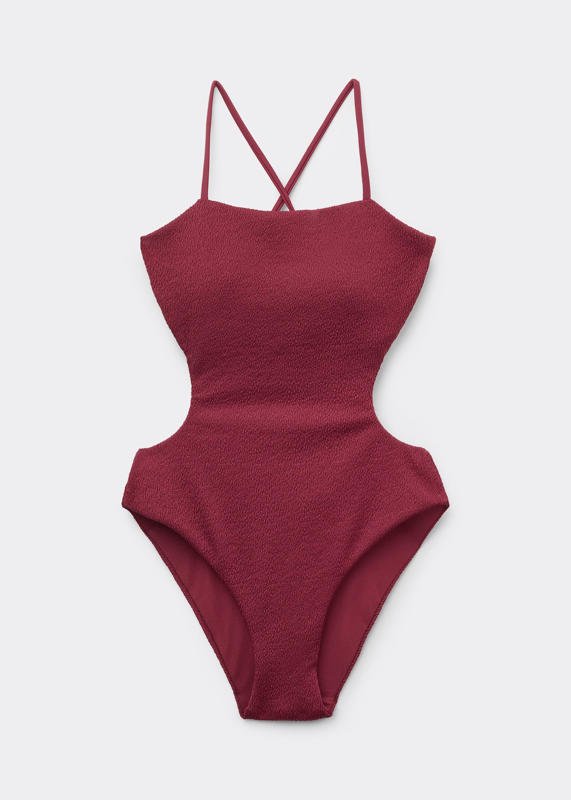 Wireless one piece swimsuit with light padding, with elegant openings at the sides and back. The crisscross shoulder straps and sensual closure with adjustable straps in back stylishly highlight the silhouette. Made in lightly ruched 3D fabric, it is fully lined for optimal comfort. Brief-style fit.