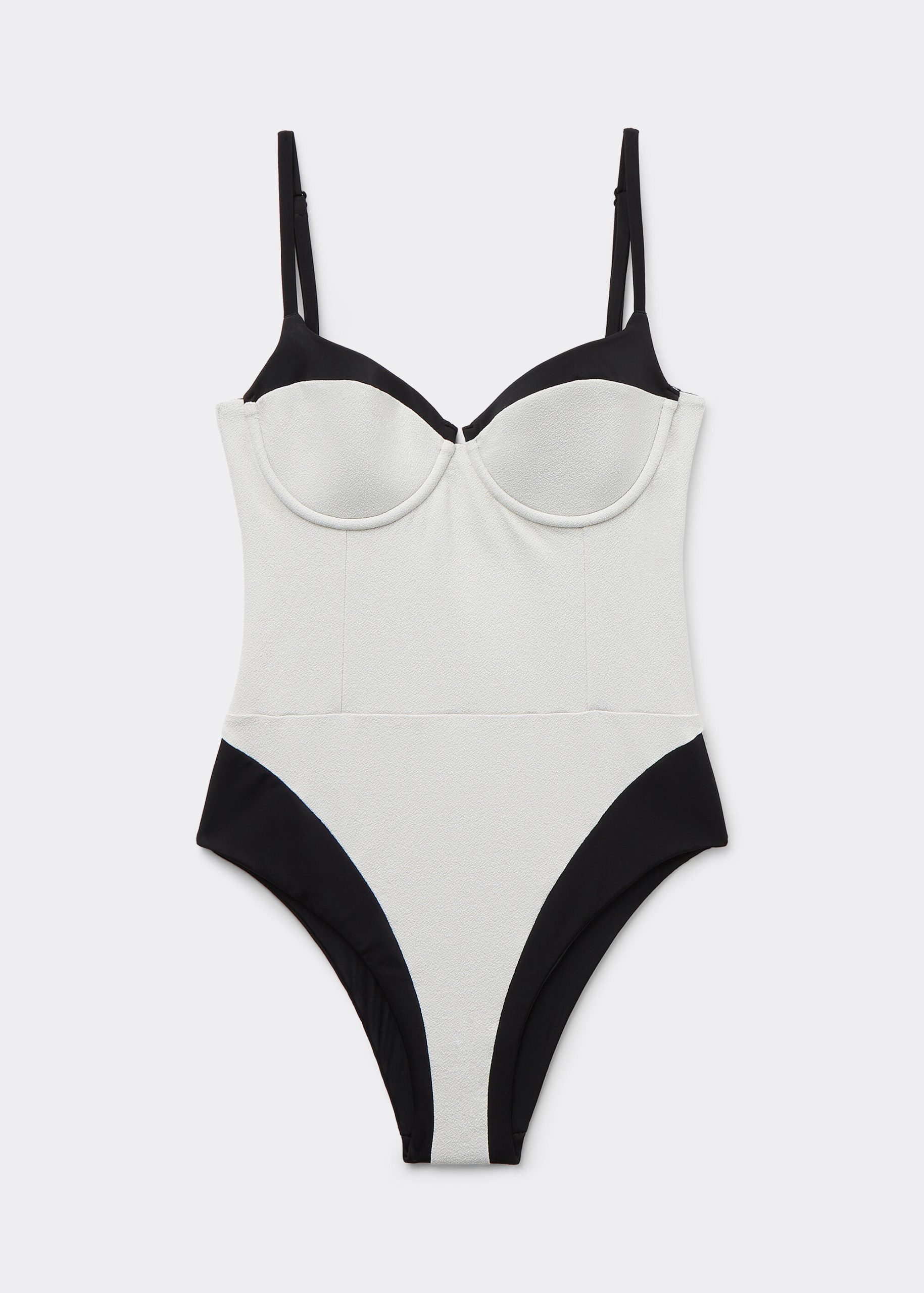 One piece swimsuit boasting a refined design, with lightly padded cups and underwire for an optimal fit. Featuring adjustable narrow shoulder straps, it stands out due to the elegant layering effect with integrated bustier that adds a touch of fashion and enhances the silhouette. The back has a regular fit on the bottom and string tie closure, providing ultimate comfort and freedom of movement.