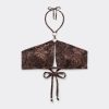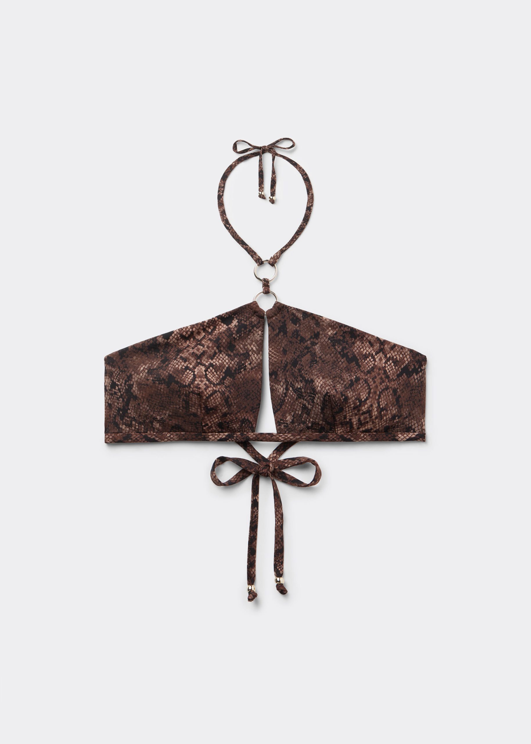 Lightly padded tank-style bikini top, wireless for a natural effect. The side boning helps support the bust. nThe style features a sophisticated dark brown animal pattern embellished with a cut out at the center of the bust and with small nickel-free rings, providing a touch of modernity and fashion. Back string tie closure.