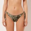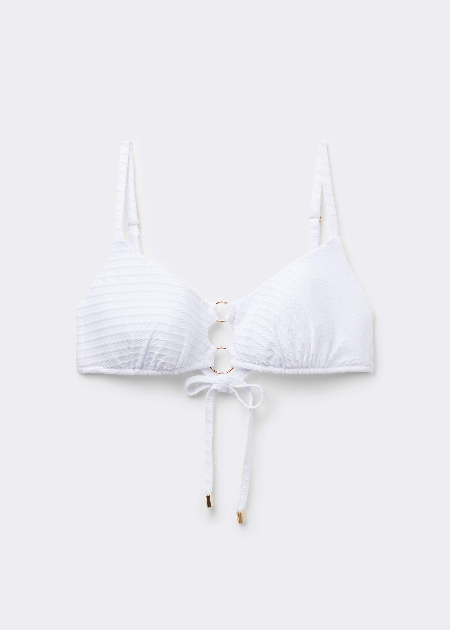 Wireless tank-style bikini top with lightly padded cups. The side boning helps support the bust. The style features an opening at the center of the bust embellished with two small nickel free rings. Three-dimensional especially soft fabric with diagonal motif. Adjustable shoulder straps and thin tie closure on the back embellished with golden tips.